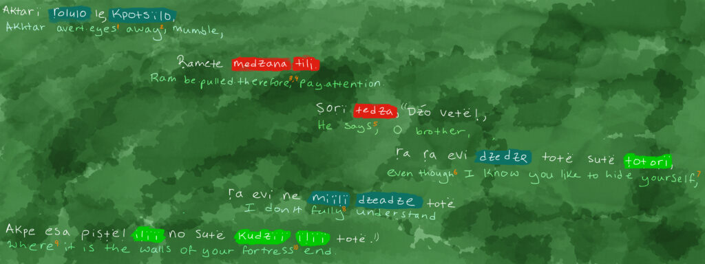 The third line of this starts with ‘he says’, but there is no possible ambiguity about which ‘he’ is saying it the Atsi translation. Besides the inherent logic, Akhtar is introduced in the mobile noun class (as he’s being fidgety), and Ram is introduced in the default noun class – as this is a moving class pronoun, it’s obvious who is saying something. Akhtar gets the moving class because he is responsive to Ram, and hence inherently more mobile, and because he is fidgeting. If their relationship were unequal – which it’s not -, he could have the body needs noun class to indicate he is in service to Ram.